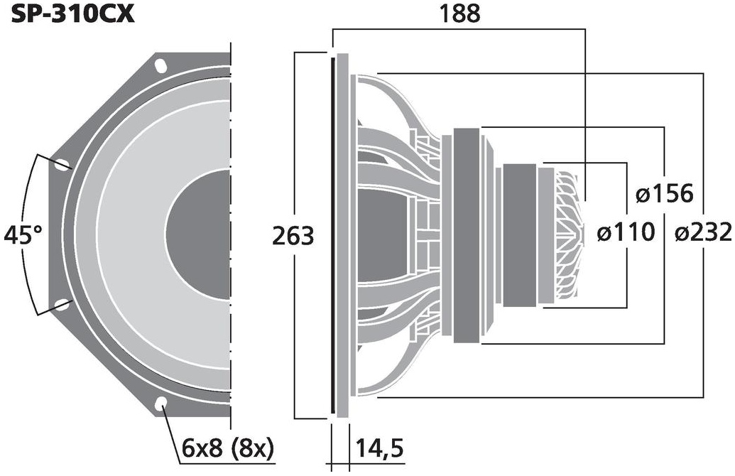 Profi-PA-2-Wege-Koaxiallautsprecher mit integriertem Hornhochtöner. 6,4kg, AD 263mm. Bass: 200W RMS, 8Ohm, 96dB/W/m, 50-3000 (2000)Hz, 64mm Schwingspule, ca. 35l BR, Xmax +/-2,5mm. HT: 50W RMS, 8Ohm, 105dB/W/m, 44mm Schwingspule, Einsatz ab 1,8kHz.
