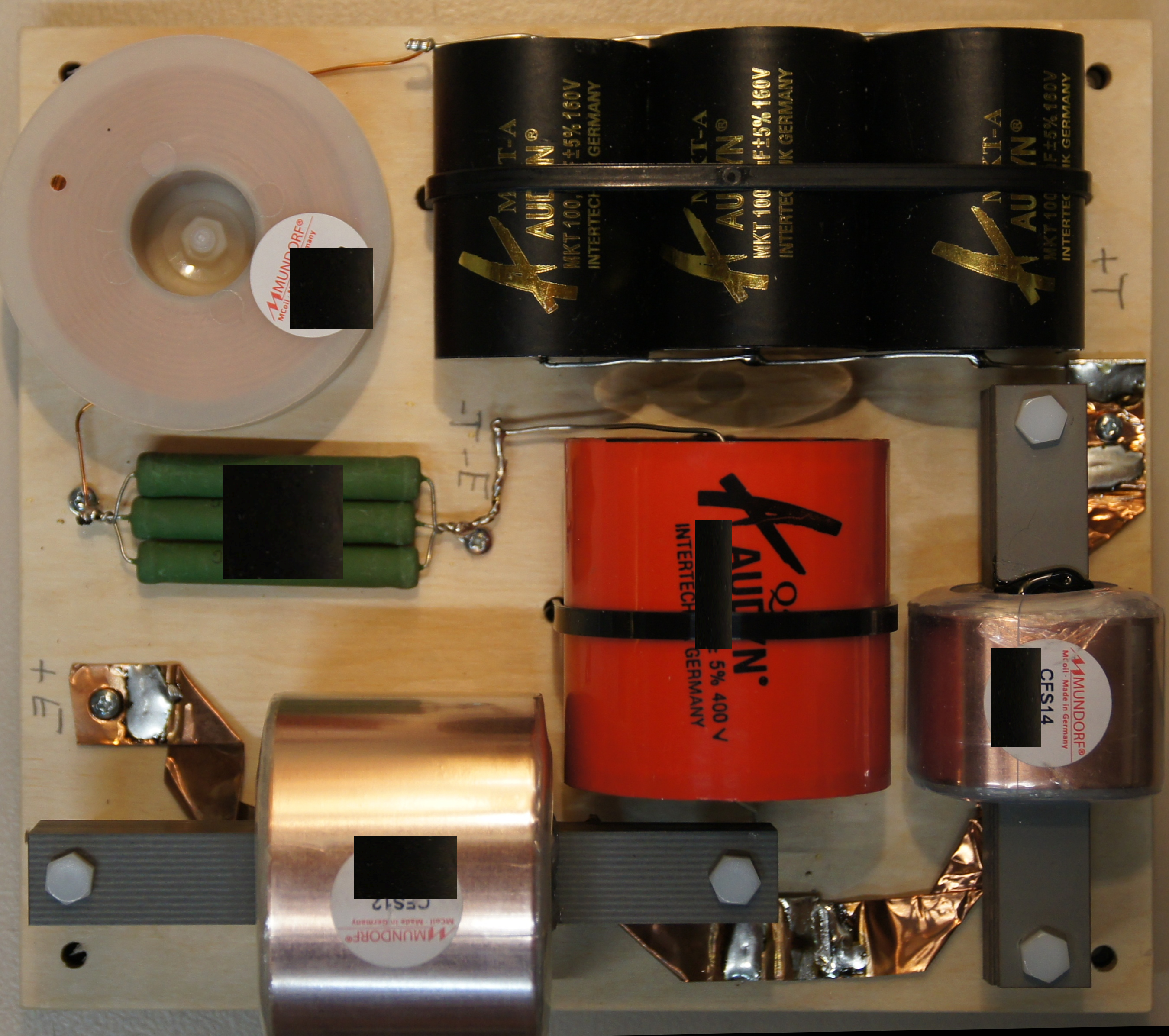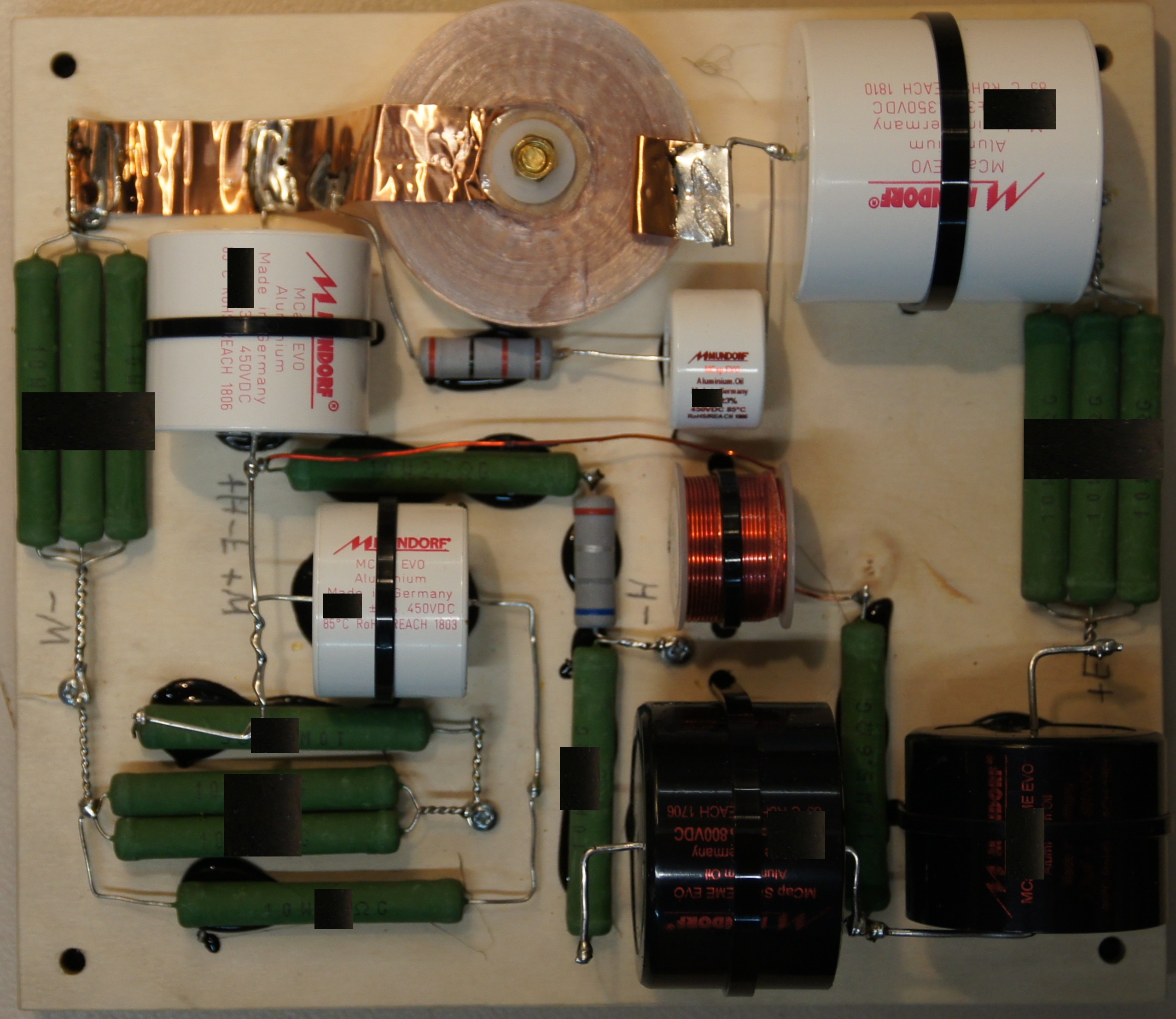 Weichenaufbau auf Multiplex-Brett. Ausschließlich mit den Bauteildrähten handverdrahtet, um negative klangliche Einbußen zu vermeiden.