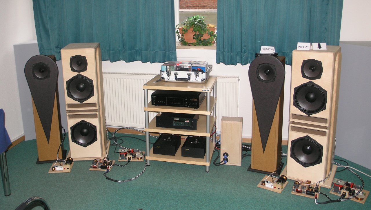 Dieses Jahr stand alles im Zeichen des Koax-Lautsprechers X17-1240TWX von PHL. Mit dabei war die bekannte Point "P", dieses Mal aber mit einem wesentlich hübscheren Ständer, in den noch ein Subwoofer eingeschoben war. Dieser war mit dem gleichen Treiber wie die Point "P" bestückt, dem B25-3002.