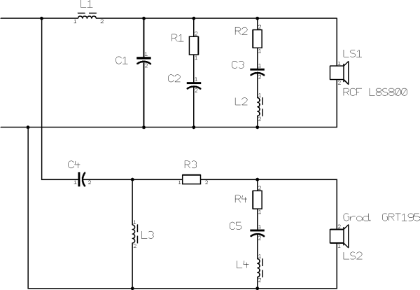 Eine klassische Weiche mit 12dB/Oktave Filtersteilheit. Trennung bei ca. 2000Hz